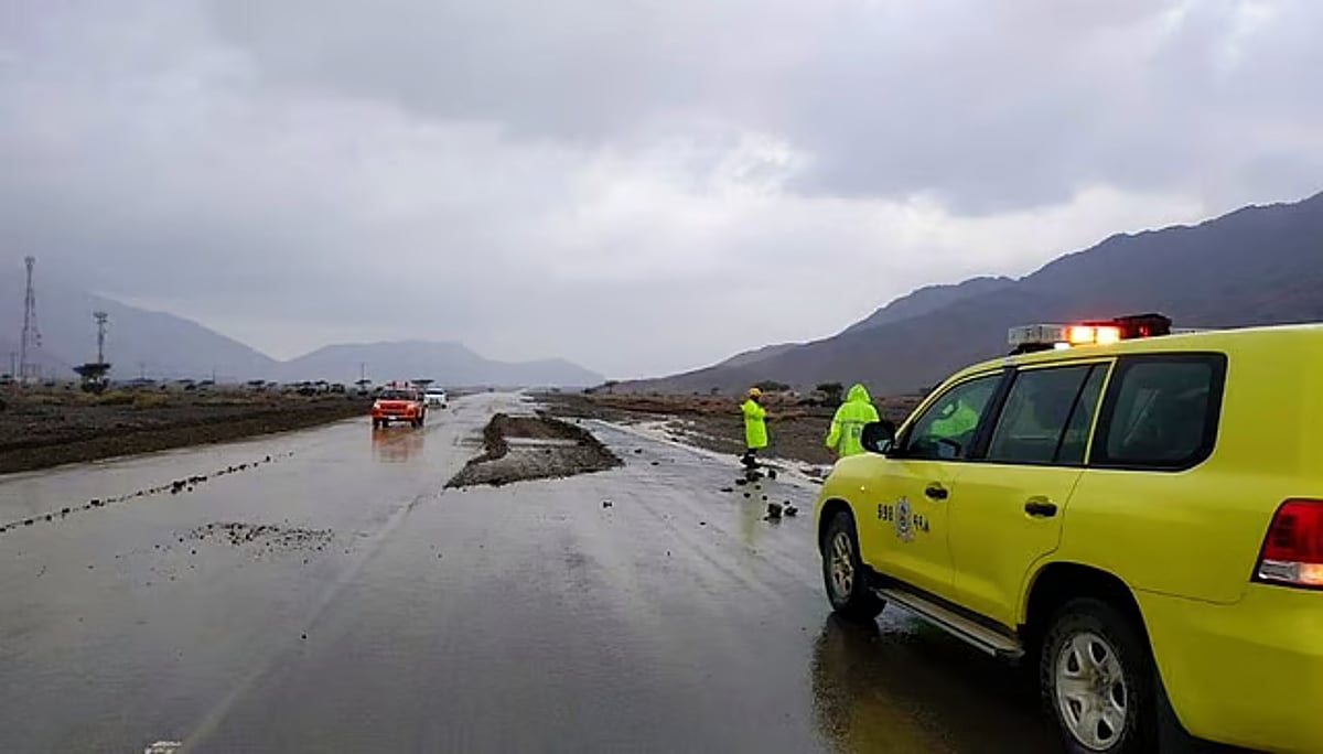 وتشهد منطقة تبوك منذ أيام هطول أمطار غزيرة أدت إلى تشكل سيول منحدرة من الجبال باتجاه الأودية، وسط تحذيرات مستمرة من خطورة عبور مجاري السيول