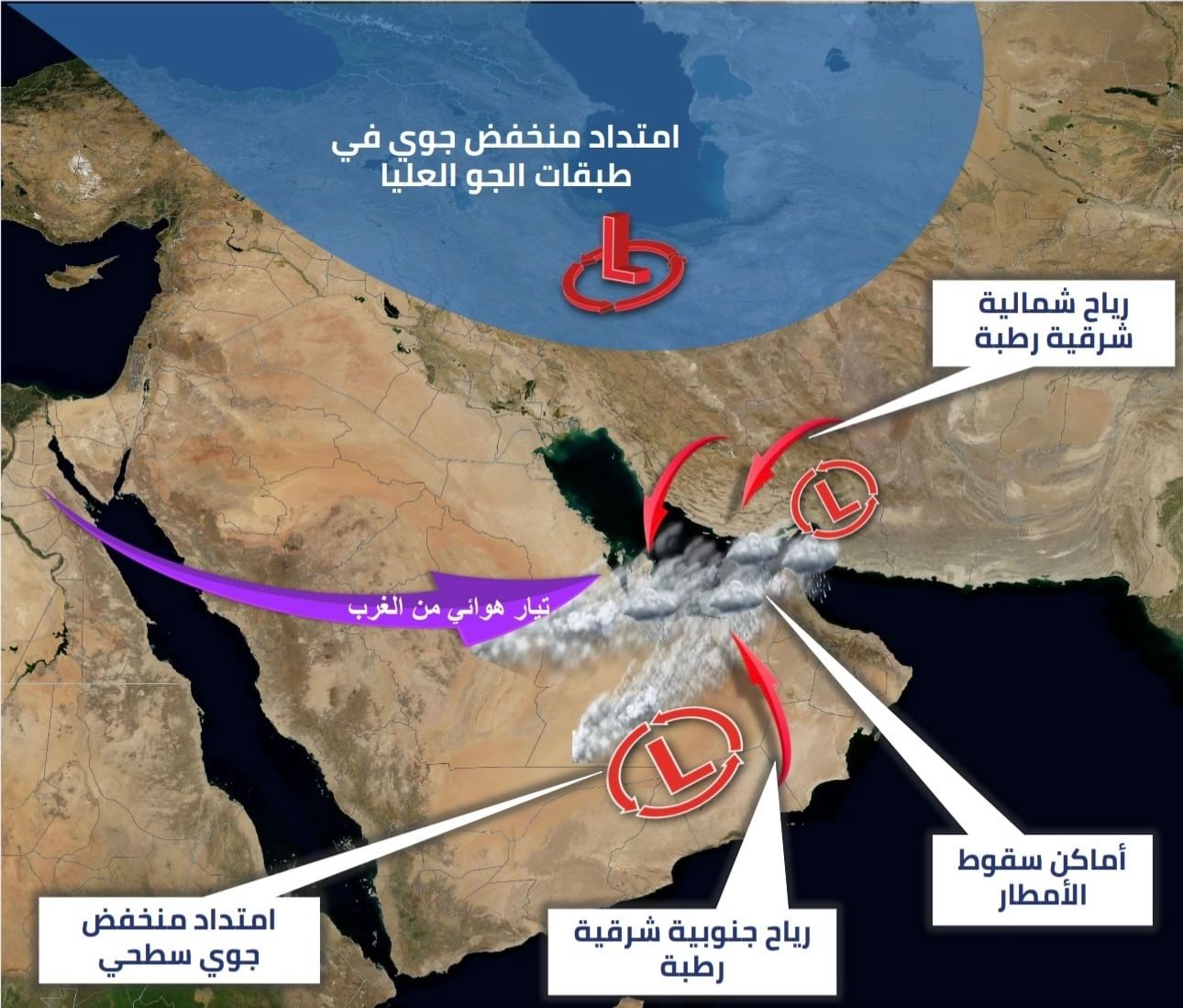توقع المركز الوطني للأرصاد أن تتأثر الدولة خلال الأيام المقبلة بامتداد منخفض جوي سطحي من الجنوب الغربي تصاحبه رياح جنوبية شرقية إلى شمالية شرقية رطبة، مع امتداد منخفض جوي في طبقات الجو العليا مصحوباً بكتلة هوائية رطبة وتيار هوائي غربي مع تدفق كميات مختلفة من السحب من جهة الجنوب الغربي والغرب.