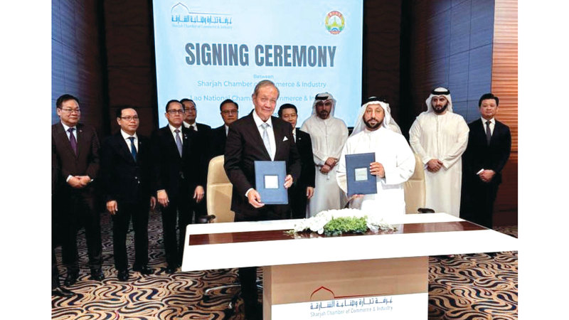 وخلال اللقاء، تطرق الجانبان إلى أهمية استكشاف الفرص الاستثمارية، وبناء جسور التواصل المباشر بين مجتمعي الأعمال، بما يسهم في زيادة التعاون في مختلف القطاعات ذات الاهتمام المشترك، حيث تزخر الشارقة بفرص نوعية في قطاعات الصناعة والخدمات اللوجستية والتجارة والسياحة والتعليم والاقتصاد الجديد، فيما تتمتع لاوس بإمكانات اقتصادية كبرى وفرص واعدة في مجالات الزراعة والطاقة والتعدين والسياحة والصناعات التحويلية، وشهد اللقاء توقيع مذكرة تفاهم بين غرفة الشارقة والغرفة الوطنية للتجارة والصناعة في لاوس، بهدف تعزيز العلاقات التجارية وتنمية وتسهيل التعاون الاقتصادي بين مجتمعي الأعمال في البلدين، ونصت المذكرة على تبادل المعلومات، بما يسهم في النمو الاستثماري والاقتصادي، وتبادل الوفود التجارية وتنظيم بعثات مشتركة، فضلاً عن تبادل المطبوعات التجارية عبر المنصات الإلكترونية، والترويج للفرص الاستثمارية المتاحة والاستفادة من الخبرات والمعارف وجوانب التدريب، وأكّد عبدالله سلطان العويس أن غرفة تجارة وصناعة الشارقة تحرص على دعم توجهات الإمارة في تنويع شراكاتها الاقتصادية، وتعزيز حضورها التجاري والاستثماري على الساحة الدولية، لاسيما مع الدول الصديقة التي تمتلك مقومات اقتصادية واعدة، مشيراً إلى أن الإمارة توفر بيئة استثمارية جاذبة ومحفزة، وتمتلك بنية تحتية متطورة وتشريعات مرنة ومناطق حرة متخصصة.