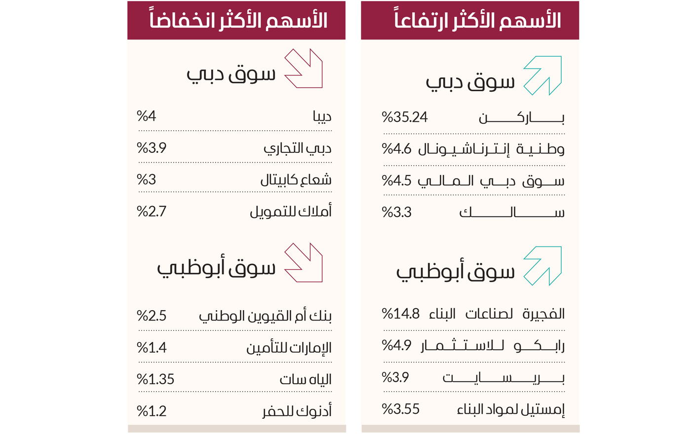 وتصدر «العالمية القابضة» النشاط في سوق أبوظبي مع استحواذه على النصيب الأكبر من إجمالي التداولات بأكثر من 202.3 مليون درهم، تلاه «ألفا ظبي القابضة» جاذباً 69 مليون درهم، ثم «الدار العقارية» بسيولة 57.2 مليون درهم. وارتفع في سوق أبوظبي أسهم الفجيرة لصناعات البناء 14.8%، ورابكو للاستثمار 4.9 %، وبريسايت 3.9 %، وإمستيل لمواد البناء 3.55 %.