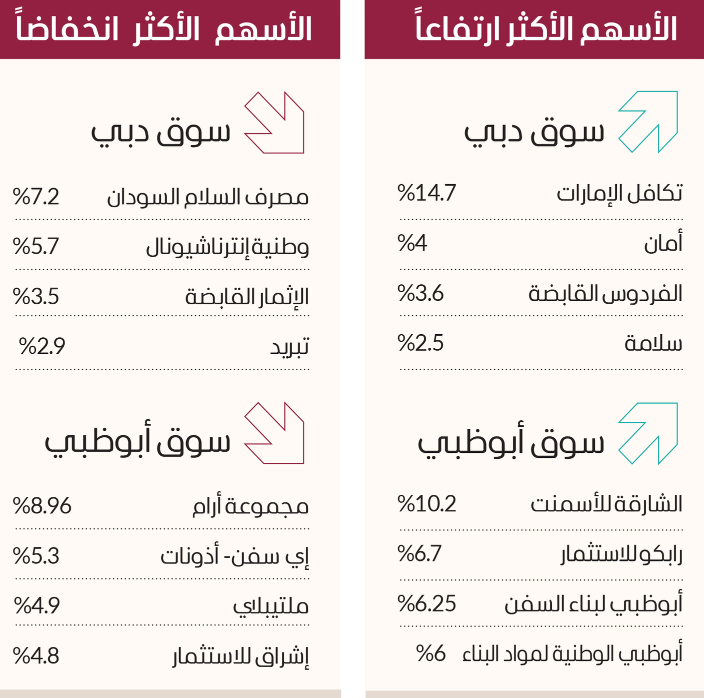 وكان ضمن الأسهم الرابحة «الشارقة للأسمنت» 10.2%، و«رابكو للاستثمار» 6.7%، و«أبوظبي لبناء السفن» 6.25%، و«أبوظبي الوطنية لمواد البناء» 6%.