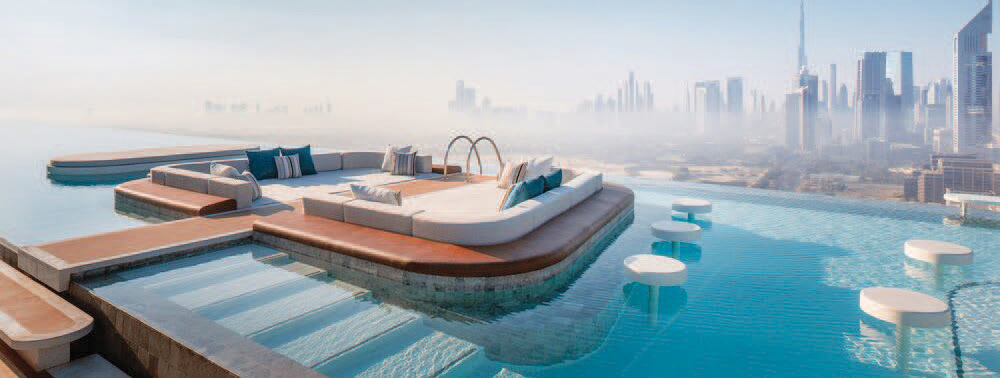 أصبحت دبي الآن موطناً لأطول حوض سباحة «لا متناه» في العالم يطفو على ارتفاع مئات الأمتار في السماء بين ناطحتي سحاب. وحسب ما ذكرت صحيفة «ذي صن» البريطانية، «يبلغ طول حمام السباحة المذهل 120 متراً.