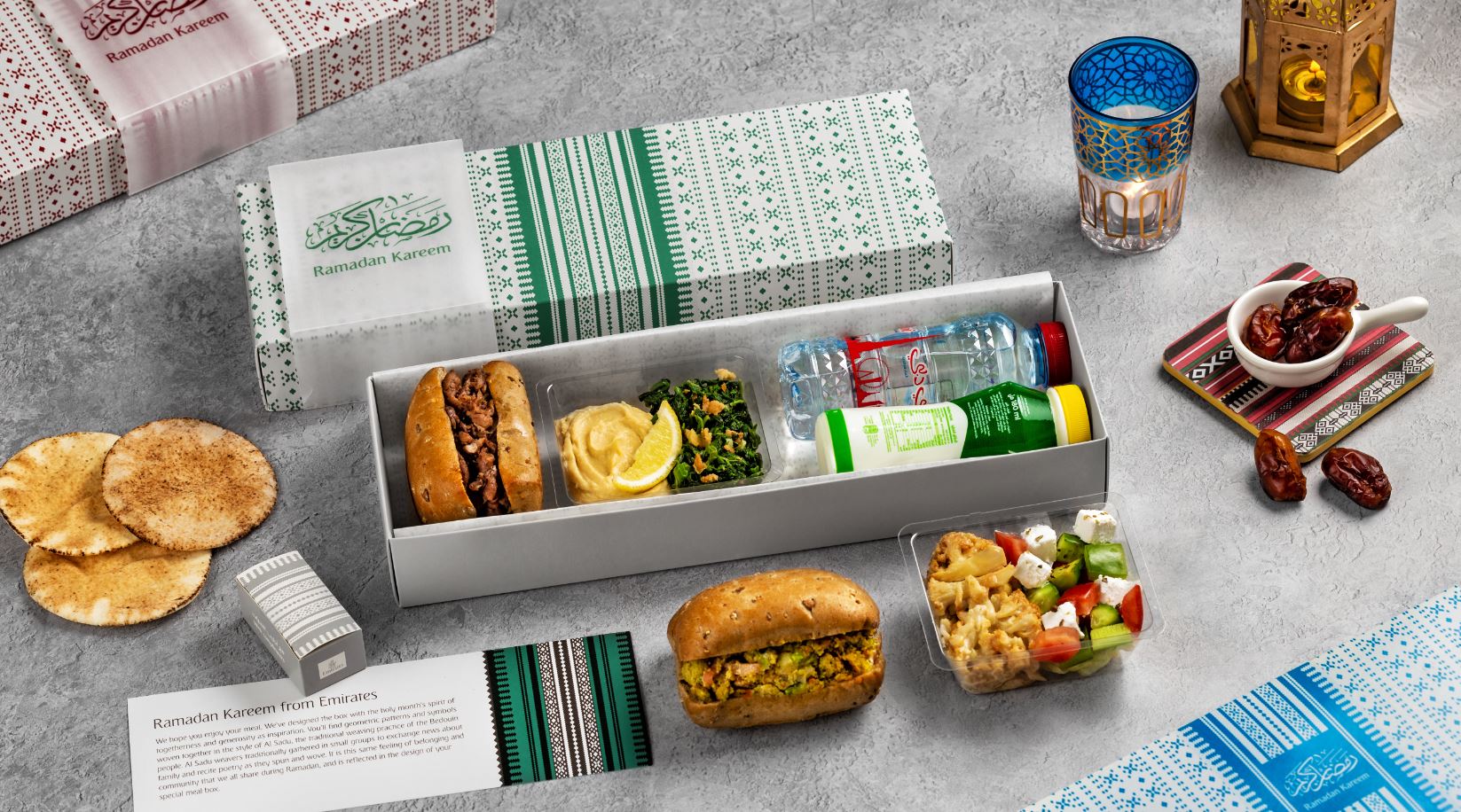 وتحتوي علب الوجبات الرمضانية على أصناف خفيفة، مثل الحمص وفطائر السبانخ والخبز العربي، والتبولة و البابا غنوج، إلى جانب شطائر الدجاج المغربي أو الزعتر مع المخلل والمايونيز بالثوم، وبعض الحلويات من الشوكولاتة باللوز والبقلاوة العربية بالكاجو والصنوبر، بالإضافة إلى الأصناف الأساسية مثل التمر واللبن. وتقدم طيران الإمارات علب الإفطار الرمضانية إلى جانب خدمة الوجبات الساخنة المعتادة.