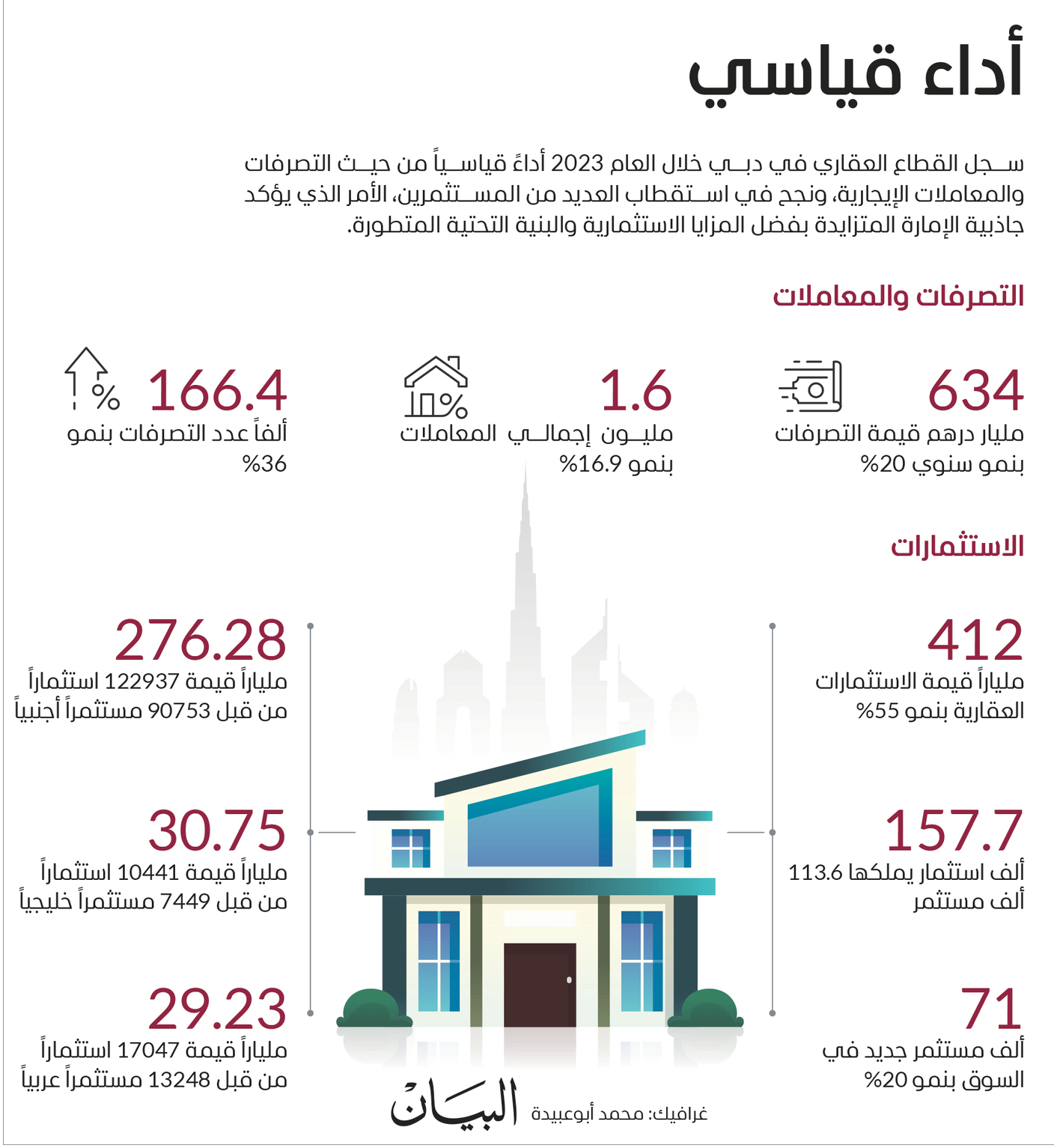 فيما كان للاستثمارات العقارية أيضاً حضورها الاستثنائي، حيث نمت قيمتها بنسبة 55% خلال نفس الفترة، لتصل إلى حوالي 412 مليار درهم، بعدد استثمارات 157,798 استثماراً، يملكها 113,655 مستثمراً، منهم 71,002 مستثمر جديد بزيادة 20%، فيما ارتفعت نسبة المستثمرين غير المقيمين لتشكل 42% من إجمالي المستثمرين الجدد».