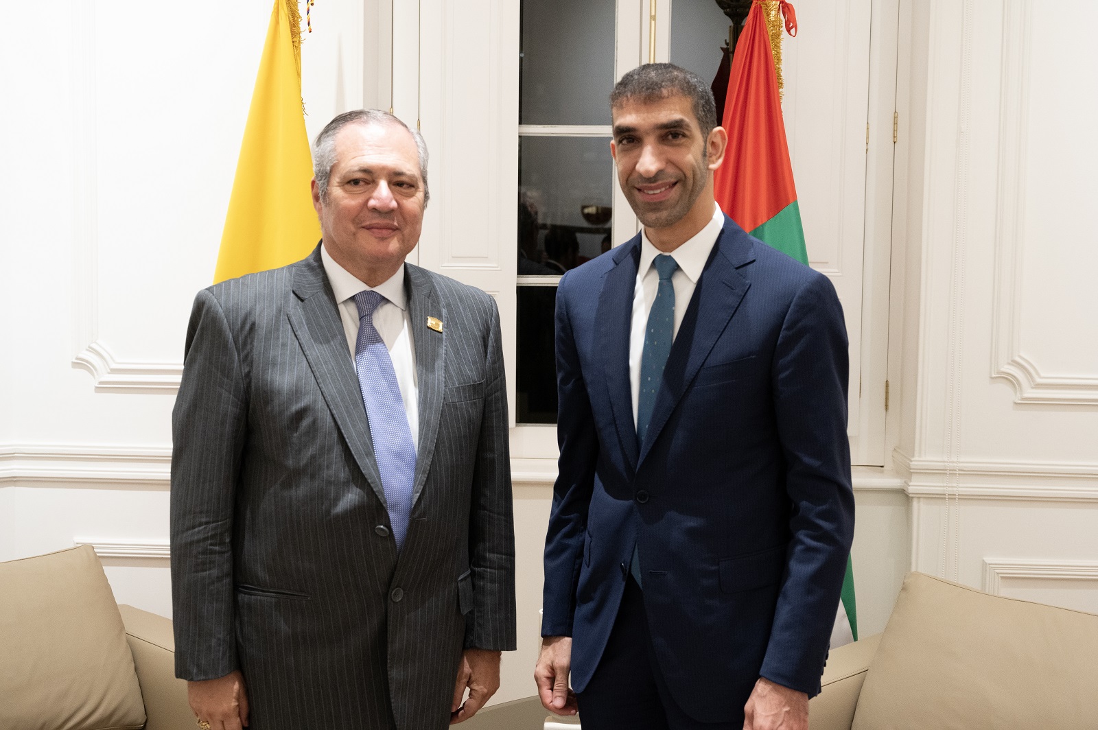 وبحث الدكتور ثاني الزيودي مع جيرمان أومانا ميندوزا وزير التجارة والصناعة والسياحة الكولومبي، تعزيز العلاقات الاقتصادية والاستثمارية والتجارية وخلق مناخ استثماري تجاري فعال بين البلدين في إطار اتفاقية الشراكة الاقتصادية الشاملة الموقعة بما يسهم في التدفق الحر للتجارة والاستثمار بين البلدين.