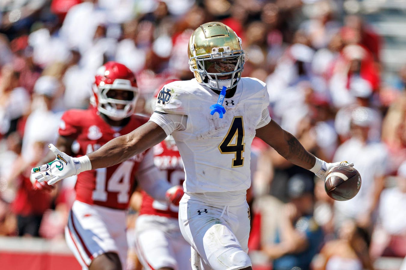 Jeremiyah Love ينطلق من أداء تاريخي في أعقاب فوز Notre Dame Fights 56-13 على Arkansas Razorbacks.