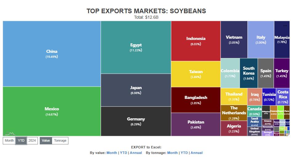 تعد المكسيك، أكبر شريك عالمي للتصدير والاستيراد للولايات المتحدة، ثاني أكبر مشتر لفول الصويا الأمريكي، بنسبة 14.67% من الإجمالي. ولم تكن أي دولة على مسافة 10 نقاط مئوية من الصين خلال أكثر من عقدين من الزمن؛ وكان الفارق حتى أكتوبر 4.82 نقطة مئوية.
