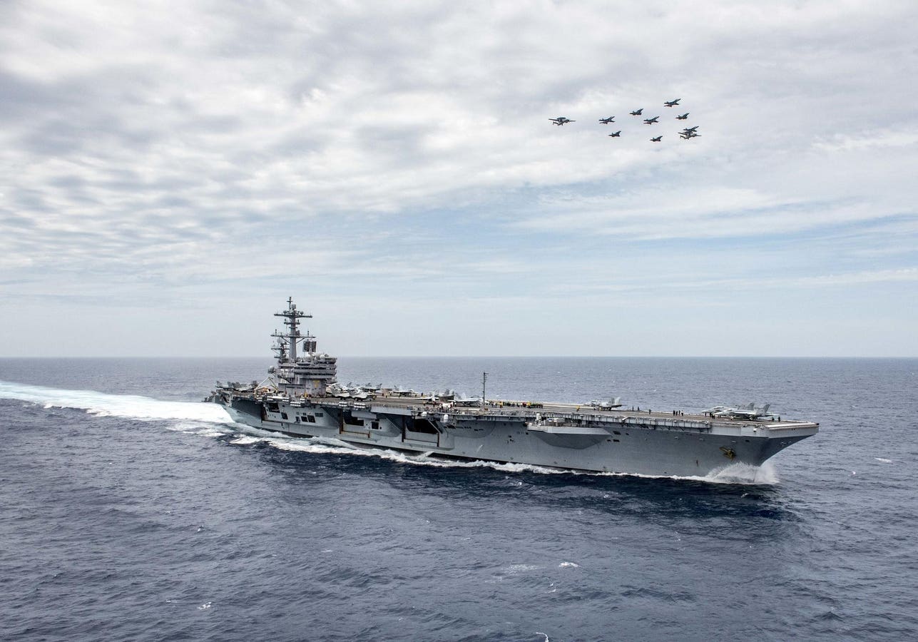 الخامس نيميتزتم رصد سطح مسطح من الدرجة وهو يغادر غرب المحيط الهادئ ويعبر مضيق ملقا يوم الثلاثاء. وستعبر الحاملة ومجموعتها الهجومية المحيط الهندي ويمكن أن تصل إلى بحر العرب أو الخليج العربي بحلول أوائل الأسبوع المقبل.