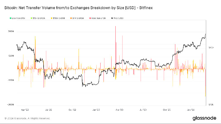 وشهد اليوم أيضًا أكبر عملية سحب للبيتكوين من Bitfinex منذ عام 2021، بما يتجاوز 240 مليون دولار. يُعزى هذا التفريغ الكبير، الذي يقدر بما يعادل 5000 بيتكوين، في المقام الأول إلى أنشطة الحيتان الكبيرة.