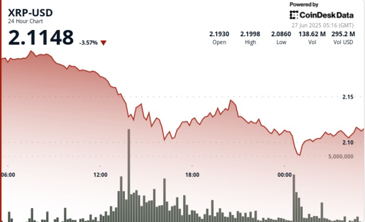 انخفض XRP من 2.21 دولار إلى 2.10 دولار خلال فترة 24 ساعة ، مما يمثل انخفاضًا بنسبة 5.3 ٪ في نطاق 0.13 دولار. حدثت عملية بيع أكثر حدة بين الساعة 12:00 و 16:00 بالتوقيت العالمي في 26 يونيو ، مع ارتفاع حجم الساعة المتتالية فوق 99 مليون XRP حيث انخفض السعر إلى 2.10 دولار. تشكلت المقاومة بوضوح عند 2.17 دولار ، مع فتيل الرفض المتعدد فوق 2.12 دولار في وقت لاحق في الجلسة.