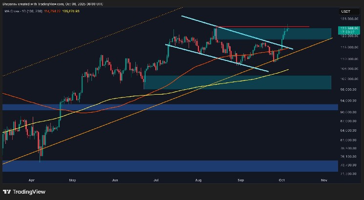 في الإطار الزمني اليومي ، نجحت BTC في كسرها فوق نمط العلم الذي حصر إجراء السعر منذ يوليو ، مما يؤكد استمرارًا قويًا للاتجاه. تزامنت هذه الخطوة فوق الحدود العليا مع زيادة في الزخم الذي حمل السعر في منطقة التوريد السابقة حوالي 124 ألف دولار و 126 ألف دولار ، حيث بدأ البائعون في إظهار مقاومة خفيفة.