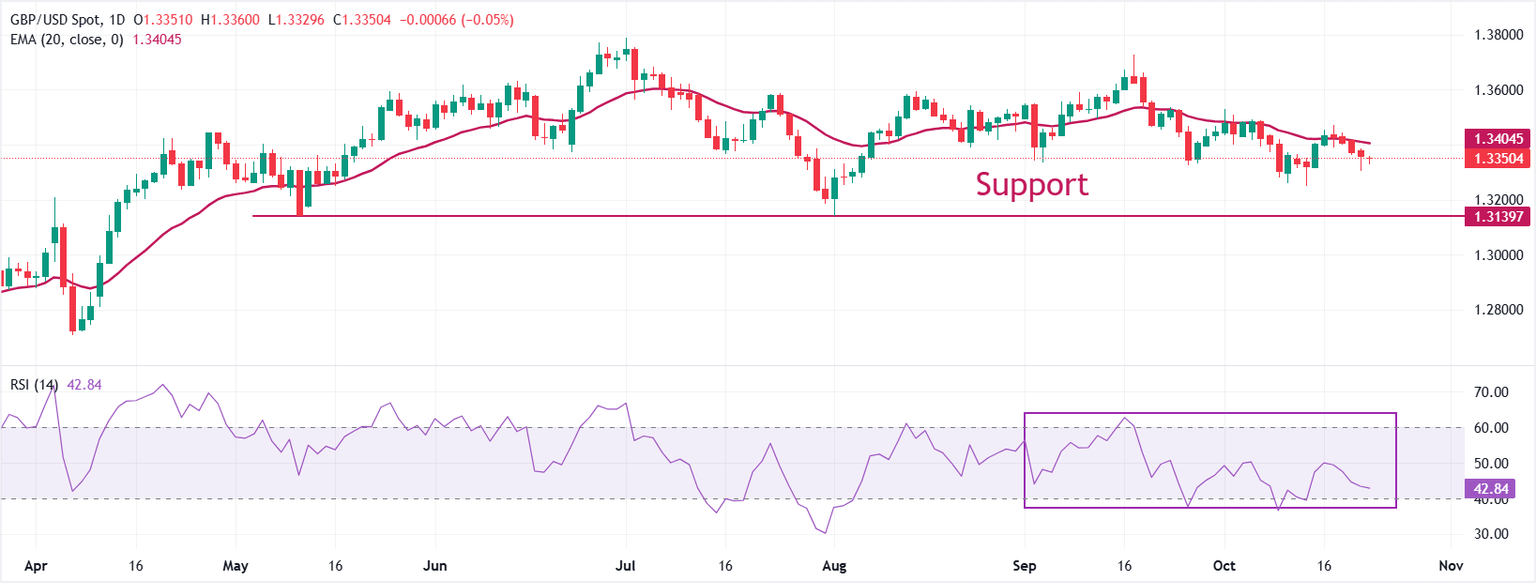 ويتداول الجنيه الإسترليني ضمن نطاق تداول يوم الأربعاء حول مستوى 1.3350 مقابل الدولار الأمريكي في وقت كتابة هذا التقرير. لا يزال الاتجاه على المدى القريب لزوج استرليني/دولار GBP/USD غير مؤكد، حيث يتداول تحت المتوسط ​​المتحرك الأسي لـ 20 يومًا (EMA)، والذي يقع بالقرب من 1.3404.
