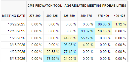 في الوقت الحالي، لا يزال مراقبو أسعار الفائدة راسخين في إيمانهم بتخفيضين إضافيين لأسعار الفائدة حتى نهاية العام. عند التخفيض الحالي، تظهر أداة FedWatch من بورصة شيكاغو التجارية أن أفضل سعر الفائدة يرون فرصة ضئيلة بنسبة 1٪ أن يبقي بنك الاحتياطي الفيدرالي أسعار الفائدة دون تغيير في اجتماعه القادم لتحديد سعر الفائدة، والذي يختتم في 29 أكتوبر.