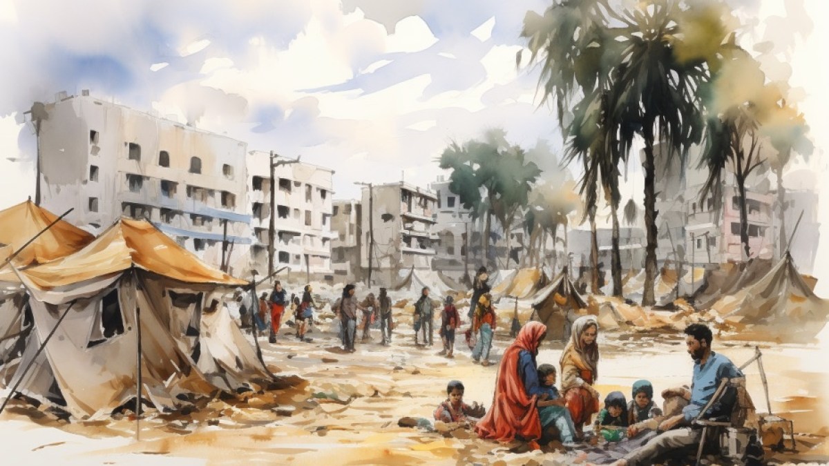 تقول أمية”على الجانب الأيسر مني تفترش الأرض عائلة هيام. صبية تزوجت منذ 5 أشهر وحامل حديثا، تم قصف بيتها، فيما كان زوجها مسافرا لفترة قصيرة إلى مصر قبيل اندلاع الحرب بأيام. لجأت إلى بيت والديها، أمها تخشى عليها وعلى جنينها من رهبة القصف، قالت لي: ليتني أستطيع أن أخبئها هي وإخوتها في رحمي من جديد! أختها سندس ذات الـ15 ربيعا، أصيبت بحصر في البول من الخوف، كانت دائمة الاهتمام ببشرتها، تضع كريما مرطبا على وجهها ويديها قبل وبعد النوم، حتى في أيام الحرب”.