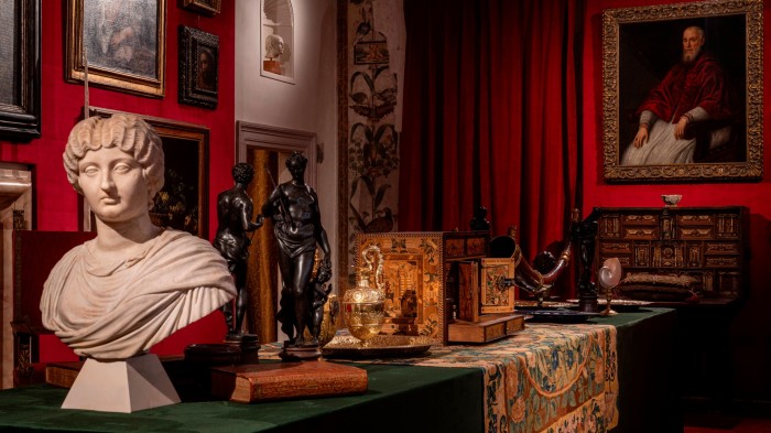 في Sala di Psiche في قصر Palazzo Grimani في البندقية، هناك طاولة مليئة بالأشياء الثمينة. من بينها قوقعة نوتيلوس فضية على حامل برونزي مذهّب وبوق كبير منحني، أو قرن، منحوت من العاج ومربوط بشرائط نحاسية معقدة. زوج من أنياب حريش البحر، ربما يبلغ ارتفاعها مترين، يحيط بمدفأة، وداخلها الحجري منحوت بسلمندر مشتعل؛ ويقفز تمثال برونزي صغير لعطارد، صنعه الموهوب جيامبولونيا في عام 1580، أمام خزانة تعود إلى القرن السادس عشر وزخرفتها مصنوعة من شظايا من الخشب المرصع بخيوط حريرية. مع الجدران الحمراء الفخمة والإضاءة الخافتة، يبدو الأمر أشبه بالعودة بالزمن إلى الوراء، كما لو أن مالك هذه الأشياء قد غادر الغرفة للتو.
