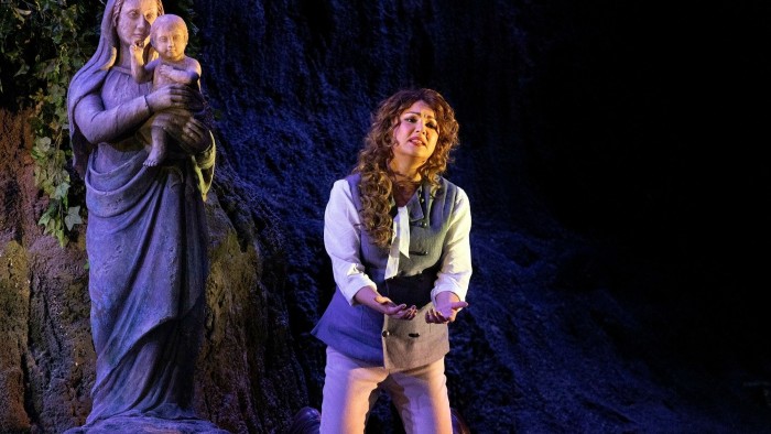 يستخدم موسكاتو مسرحًا دوارًا بحيث يمكن عرض سلسلة من المشاهد الجذابة – بساتين مضاءة بشكل مزاجي في أمسية صيفية، والرهبان الذين يحملون الشموع أمام المذبح. تسمح هذه الحيلة بالانتقال السلس إلى أرقام محددة تظهر الجوقة (في شكل متدحرج مثل الفلاحين والخدم والحجاج) مرتبة على درجات.