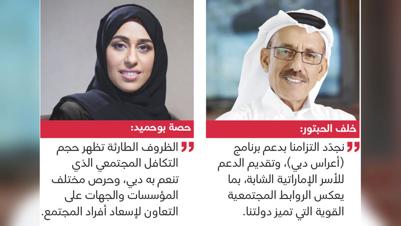 وقالت حصة بوحميد: «تؤكد الظروف الطارئة حجم التماسك المجتمعي التي تحظى به دولة الإمارات ولله الحمد، وتُشكل مجموعة الحبتور إحدى أبرز الجهات الفاعلة في مجال المسؤولية المجتمعية، ومن أبرزها المبادرات المتعلقة بدعم المقبلين على الزواج، وتسهم استضافتهم لحفلات الزفاف المقررة لشهر أبريل لأهالي منطقة الليسيلي في التأكيد على أن برنامج (أعراس دبي) الذي انطلق بتوجيهات كريمة من سموّ الشيخة هند بنت مكتوم بن جمعة آل مكتوم، هو مبادرة مشتركة يقدّم كل منا فيها ما يستطيع للتخفيف عن المقبلين على الزواج وتعزيز استقرارهم وسعادتهم».