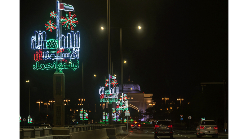 وشكلت الإنارات بأشكالها وأنواعها المختلفة لوحة بانورامية ممتدة، أضافت إلى مدن الدولة طابعاً احتفالياً مميزاً يجمع بين الأصالة والحداثة، كما ازدانت الساحات العامة بعروض ضوئية تفاعلية، تمنح الجمهور تجربة بصرية نابضة بروح الاتحاد.
