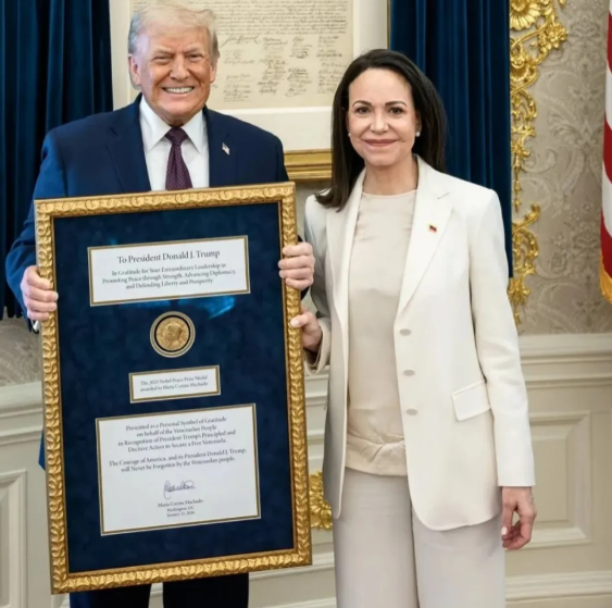 وكتب ترامب على منصته “تروث سوشيال”: “قدمت لي ماريا جائزة نوبل للسلام التي حازتها تقديراً للعمل الذي أنجزته. يا لها من لفتة رائعة تعكس الاحترام المتبادل. شكراً يا ماريا”.