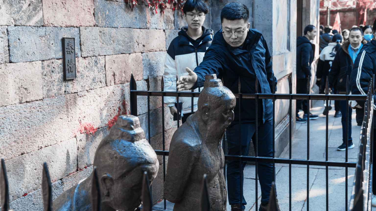وتم استبدال التمثالين، اللذان نُصبا لأول مرة في عهد أسرة مينغ في القرن الخامس عشر، إحدى عشرة مرة بسبب حجم الإساءة الهائل. ويعود تاريخ التمثالين الحاليين إلى عام 1979، وقد تآكلا وتآكلت آثارهما نتيجة قرون من الاستياء الجماعي. ويصفع الزوار التمثالين طلبًا للحظ، أو للولاء، أو للفخر الوطني، وأحيانًا لمجرد المشاركة في الطقوس. ويبيع المرشدون السياحيون عصيًا ليتمكن السياح من ضرب المنحوتات بقوة أكبر.