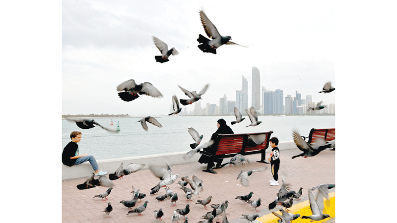 وسط دهشة العيون الواعدة، «يطير الحمام.. يحط الحمام» على كورنيش أبوظبي، راسماً في الأفق مشهداً مبهجاً، لتكتمل جلسة هذه العائلة السعيدة في ظل أجواء الطقس الرائع، وأجمل شتاء في العالم، وبين أصوات رفرفة طيور ترمز دوماً للسلام في وطن الأمان.. بقلب عاصمة دولة الإمارات التي تسع الجميع، وتفتح قلبها لاحتضان الكل.