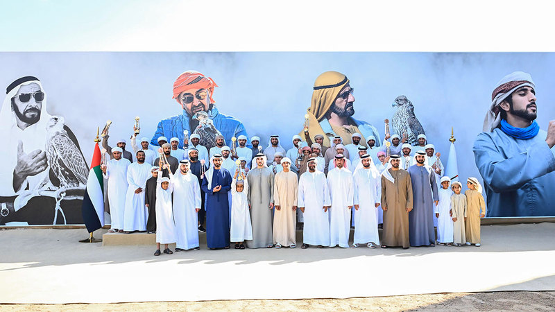 والتقطت لسموّ الشيخ محمد بن راشد بن محمد بن راشد آل مكتوم صورة تذكارية مع الصقّارين الفائزين، في ختام النسخة الثانية من كأس فزّاع لسباقات الصقور.