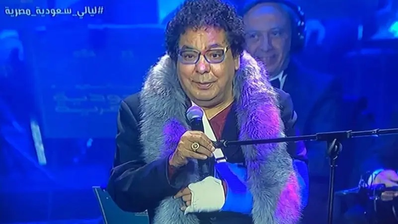 ودخل منير إلى المسرح بخطوات بطيئة، متأثرا بالإصابة التي تعرض لها، وسط تصفيق حاد من حضور الحفل، وتوجيههم التحية على حضوره.