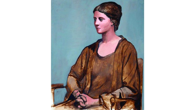 وبعد أكثر من عقد من الزمن، تبنّى بيكاسو لغة بصرية مختلفة تماماً، وفي صورة لامرأة جالسة (أولغا) (1923)، عاد بيكاسو إلى الواقعية واعتنق أسلوباً كلاسيكياً جديداً تأثر فيه برحلاته إلى إيطاليا، إذ تركت المنحوتات القديمة والفسيفساء الرومانية أثراً عميقاً في أعماله، وتظهر تلك اللوحة المرأة الجالسة، زوجته الراقصة الأوكرانية أولغا خوخولوفا، في وضع هادئ تغمره مسحة من الحزن، تستحضر من خلالها تماثيل الإغريق والرومان. وهذا العمل مرسوم بدرجات من اللون البني الدافئ وبلمسات فرشاة ناعمة تستحضر التصوير الفوتوغرافي المبكر، وهو ما يجعله على النقيض تماماً من الهندسة المتكسرة في لوحة المرأة مع آلة المندولين (الآنسة ليوني جالسة).