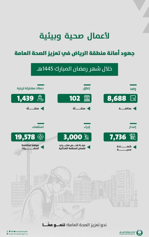 أسفرت الحملات الميدانية التي نفذتها أمانة منطقة الرياض خلال شهر رمضان المبارك، بالتعاون مع الجهات المعنية، عن رصد 8,668 مخالفة، وإغلاق أكثر من 100 منشأة، نتيجة أكثر من 1,439 زيارة للفرق الميدانية التابعة للأمانة.