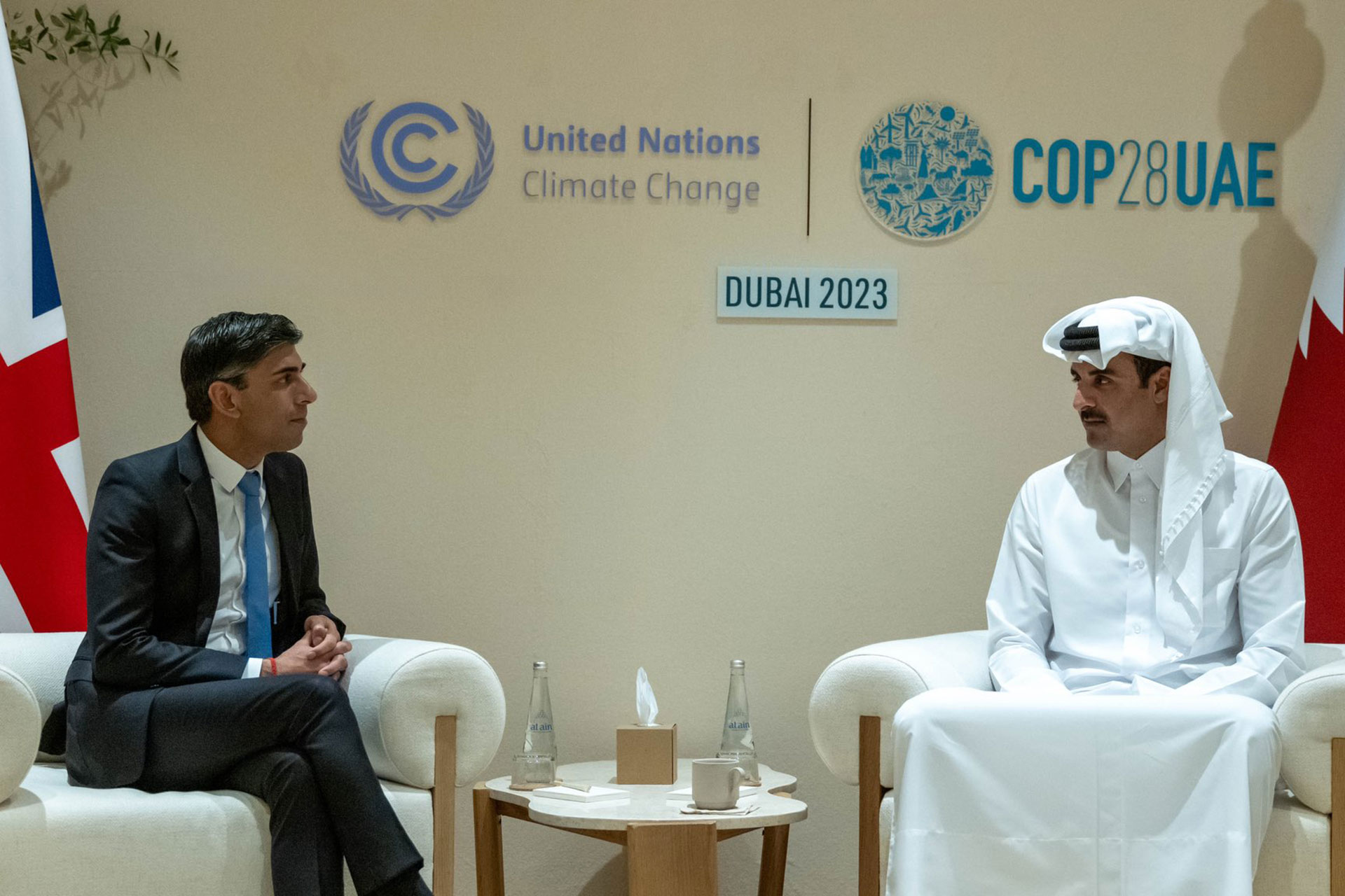 بحث أمير دولة قطر الشيخ تميم بن حمد آل ثاني ورئيس الوزراء البريطاني ريشي سوناك تطورات الأوضاع في المنطقة، خاصة الحرب على غزة، خلال لقائهما اليوم الجمعة على هامش المؤتمر الدولي للمناخ في دبي بالإمارات العربية المتحدة.
