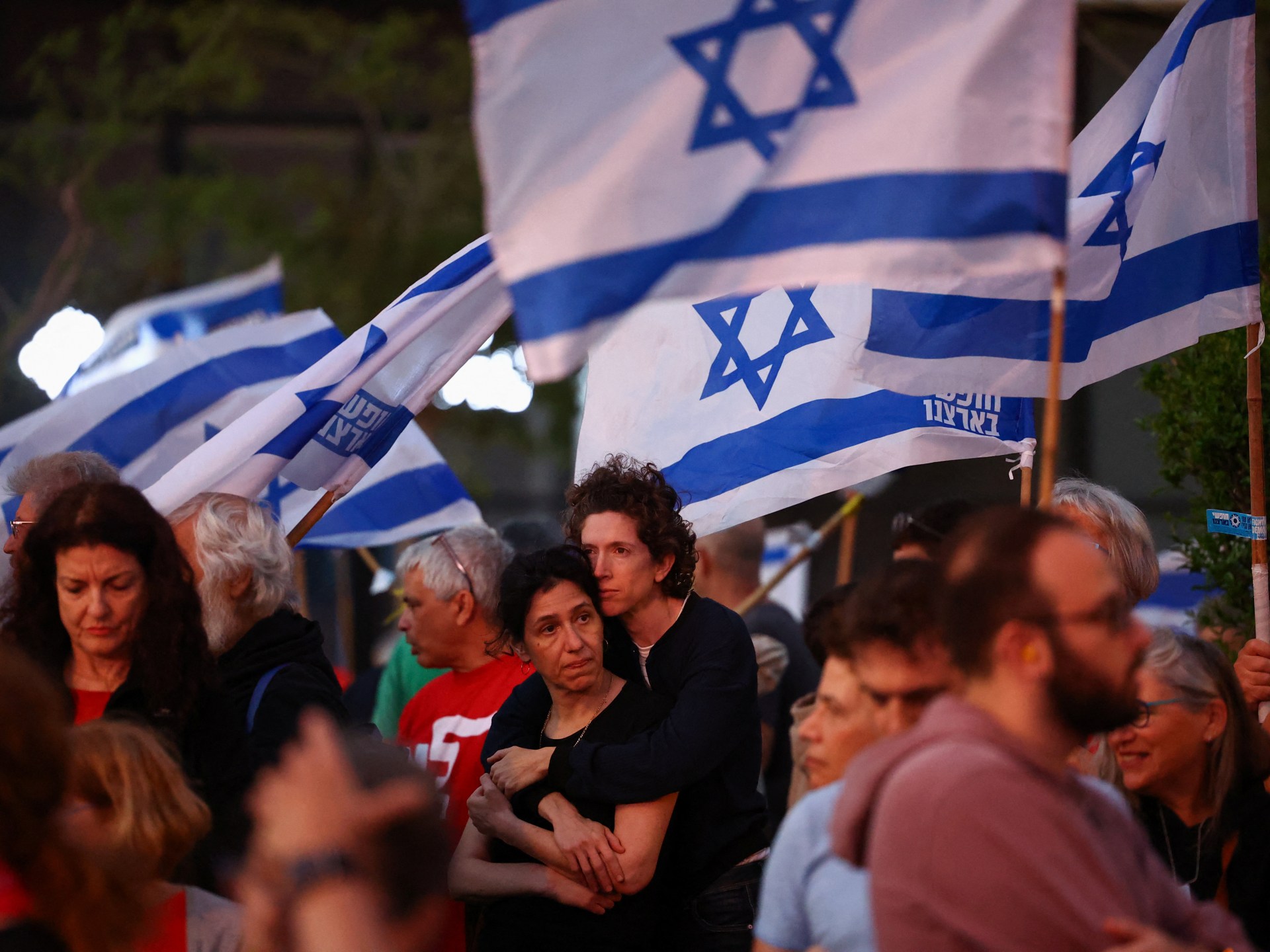 وتشهد المدن الإسرائيلية احتجاجات لأهالي الأسرى المحتجزين في غزة للمطالبة بإبرام صفقة تبادل وإجراء انتخابات مبكرة.