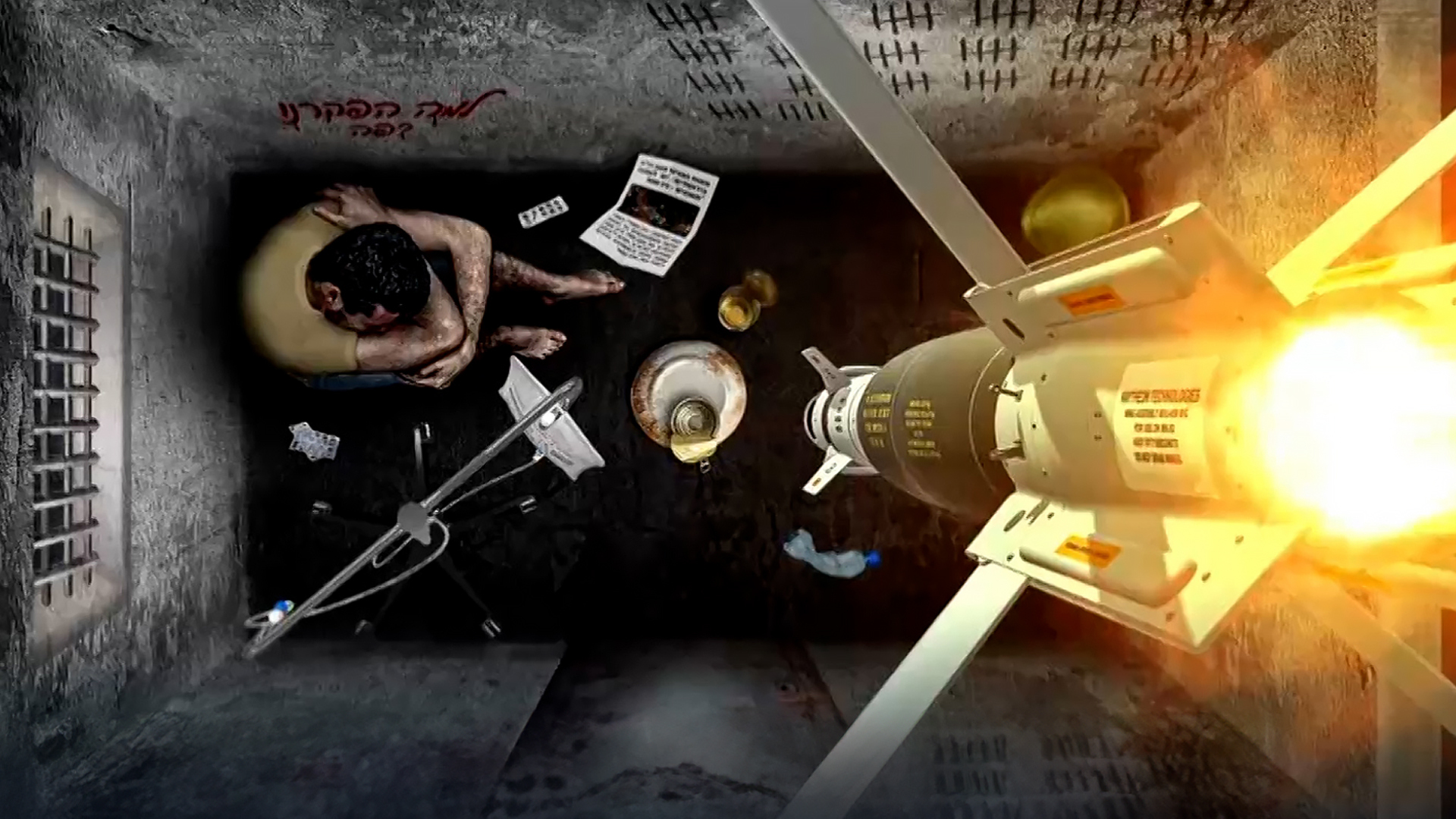 وأظهرت الصورة الأولى أسيرا إسرائيليا حيا قابعا في سجنه بغزة، وهو في قمة يأسه وحزنه بينما يسقط صاروخ ضخم عليه.