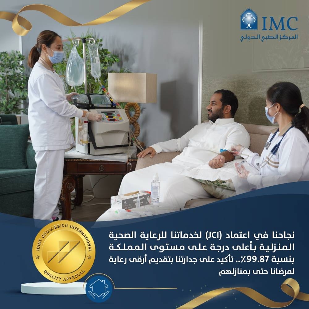 ويمثل الحصول على اعتماد الهيئة الدولية المشتركة (JCI) لخدمات للرعاية الصحية المنزلية شهادة جديدة لخبرة وموثوقية (IMC) في توفير الوقت والجهد في حصول المرضى على الرعاية الصحية ولتصل للنخبة من عملاء الـ(VIP) في منازلهم بباقات مميزة وخيارات متنوعة.