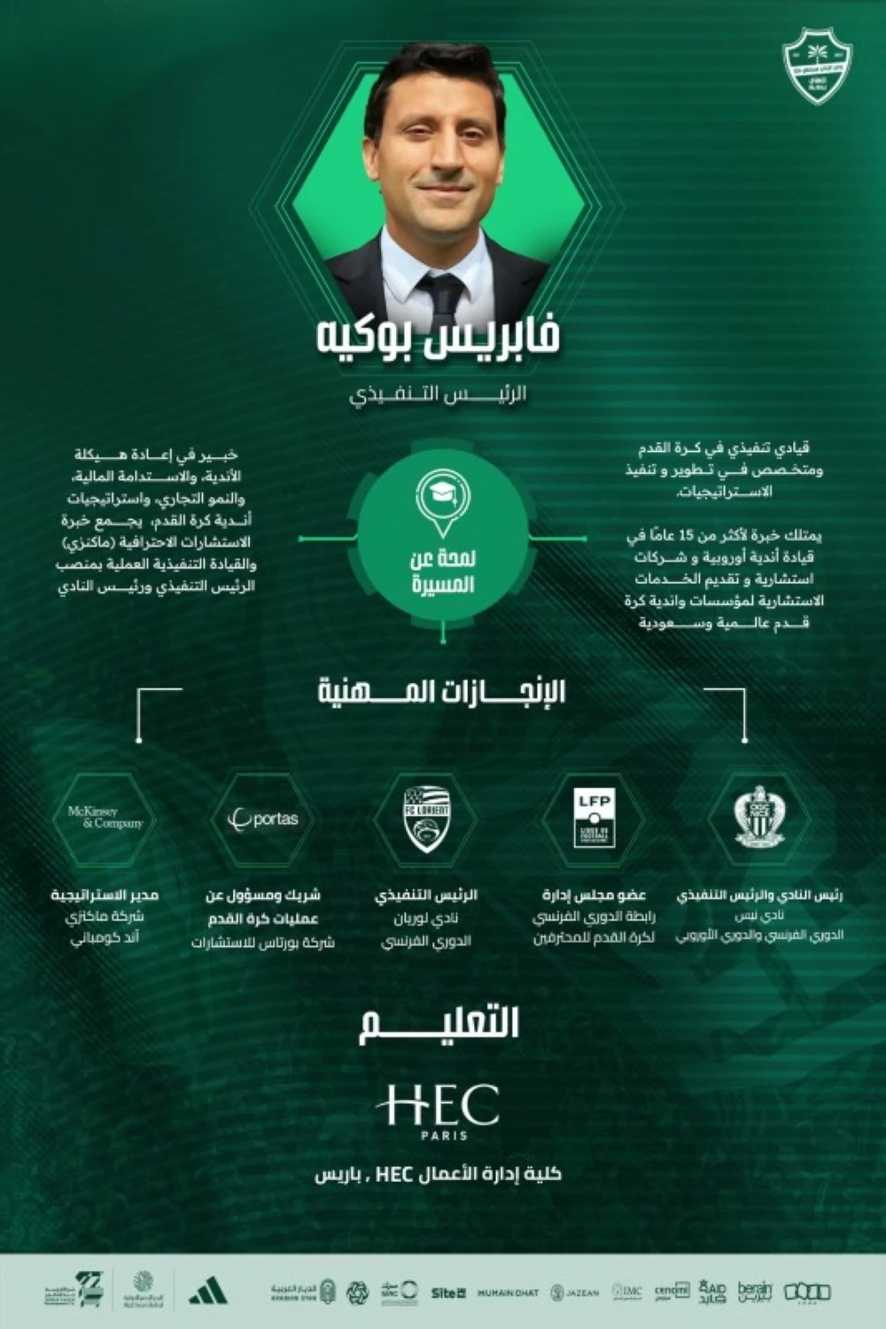 Before taking on executive roles in football, Fabrice Bocquet worked at McKinsey & Company, then at Portas Consulting, where he participated in strategic projects with the Saudi Football Federation, the Roshan Saudi League, and several sports clubs in the Kingdom.