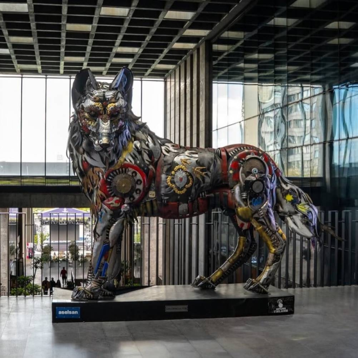 ويجسد العمل الفني، الذي يبلغ ارتفاعه 3 أمتار ويزن أكثر من 500 كيلوغرام، «الذئب الرمادي» في وضعية وقوف مهيبة، مع تفاصيل دقيقة لعينيه اللامعتين وفرائه الخشن، لكنه مصنوع من أجزاء معدنية مستعملة مثل قذائف مدفعية، وأنابيب أسلحة، وقطع معدنية من مصانع الدفاع التركية.