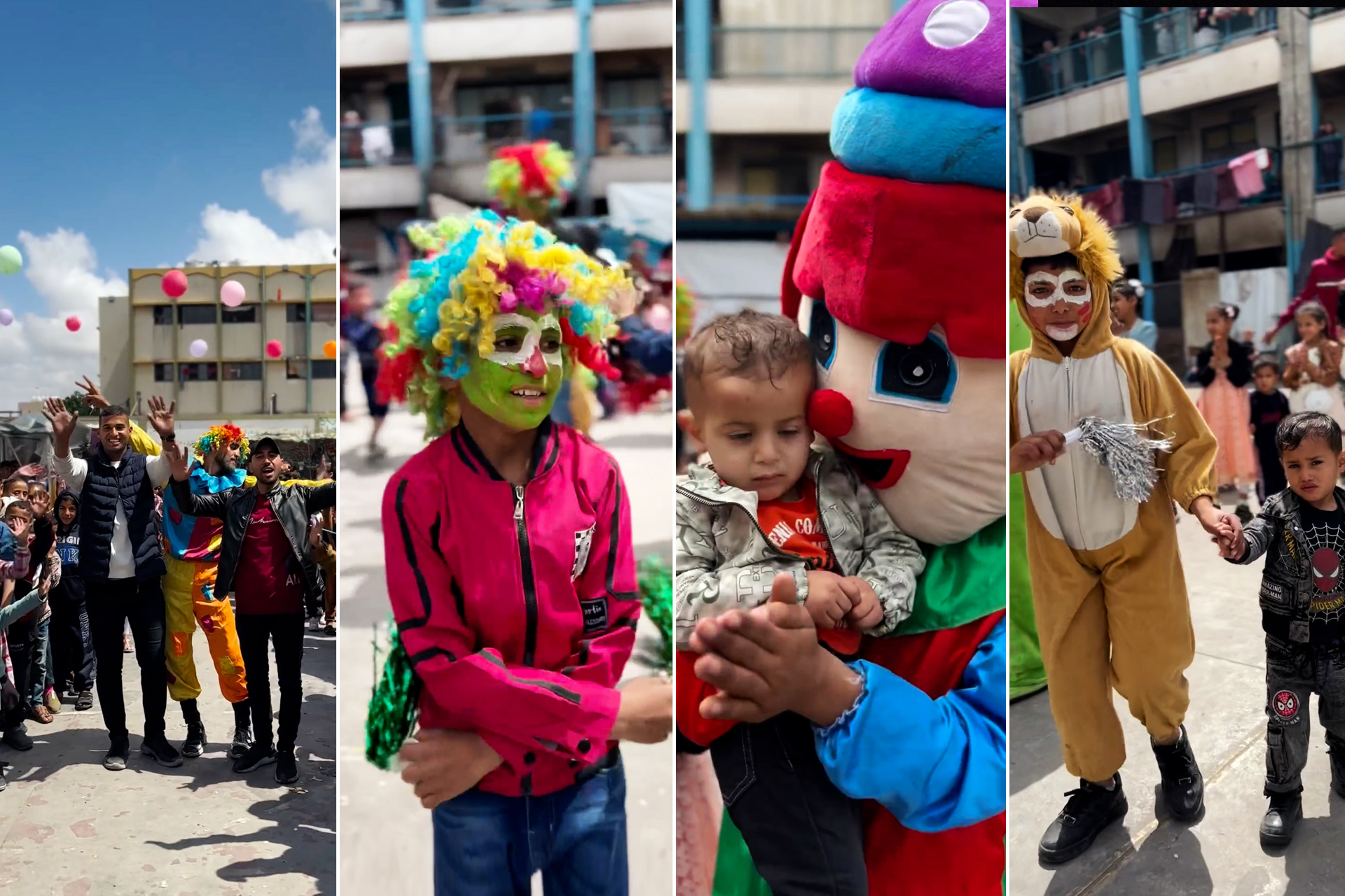 وأظهر فيديو آخر لعب أطفال غزة مع الشخصيات الكرتونية وعلق أسامة العشي صاحب المقطع على الفيديو بالقول ” فرحة أطفال غزة.. أنقاض الدمار، دون أمان، ودون ملابس، ودون عيدية، وفي كثير من الأحيان دون عائلة وأهل وأصحاب”.