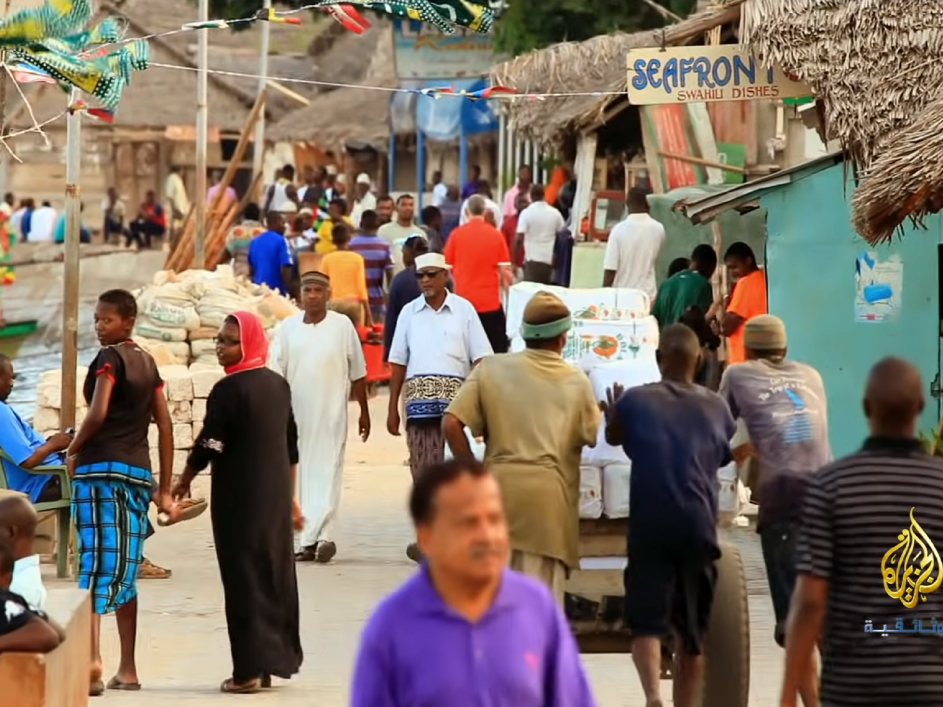وتظهر بعض مشاهد الفيلم مباني متداعية في الجزيرة، لكنها جميلة يحيط بها الهدوء، ولا تخلو من النقوش الإسلامية على الأبواب والجدران، وكأنها هاربة من القاهرة أو دمشق. وتتجلى هذه التأثيرات العربية على الساحل الكيني بقوة، بل إنها دائمة الحضور بالموازاة مع هدير الأمواج وصوت الآذان، وإذا نظرت إلى البحر من سطح المراكب الخشبية فسترى الشعب المرجانية التي تبعد كيلومترا واحدا عن الشاطئ.