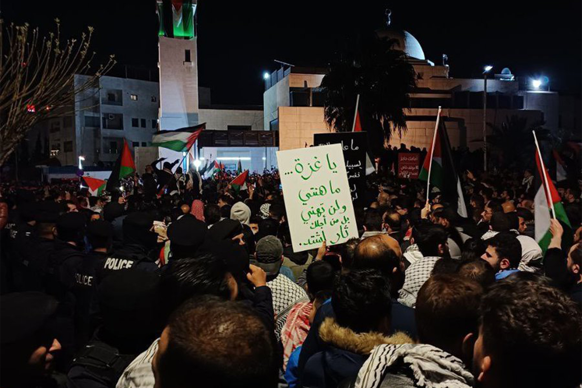 ولليوم الثالث على التوالي، واصل آلاف المتظاهرين الأردنيين احتجاجاتهم في محيط السفارة الإسرائيلية بالعاصمة الأردنية عمّان تنديدا بالحرب الإسرائيلية على غزة، ورددوا هتافات مؤيدة للمقاومة في القطاع الفلسطيني المحاصر.