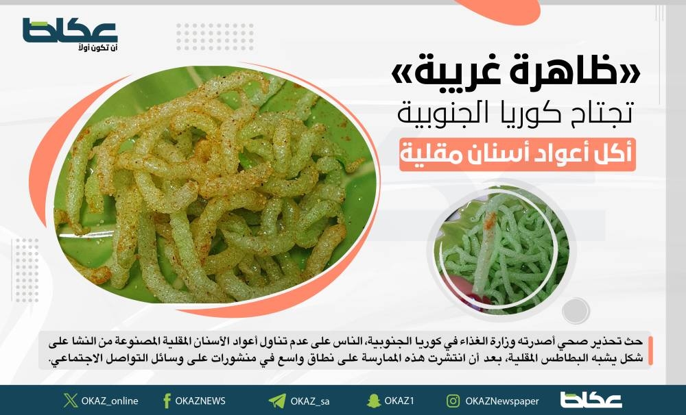 حث تحذير صحي أصدرته وزارة الغذاء في كوريا الجنوبية، الناس على عدم تناول أعواد الأسنان المقلية المصنوعة من النشا على شكل يشبه البطاطس المقلية، بعد أن انتشرت هذه الممارسة على نطاق واسع في منشورات على وسائل التواصل الاجتماعي.