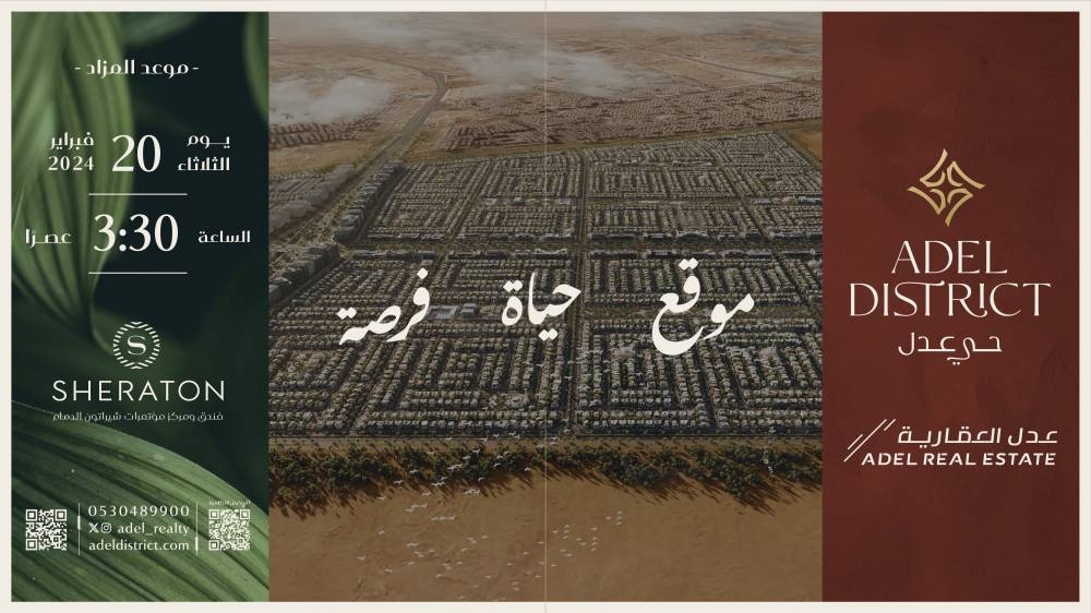 أعلنت «عدل العقارية» الشركة العقارية الرائدة في المنطقة الشرقية والمملكة؛ عن طرح مخططها النوعي متعدد الاستخدامات «حي عدل» للبيع في مزاد علني يُقام في فندق ومركز مؤتمرات شيراتون الدمام يوم الثلاثاء 20 فبراير 2024م عند الساعة 3.30 عصرًا.