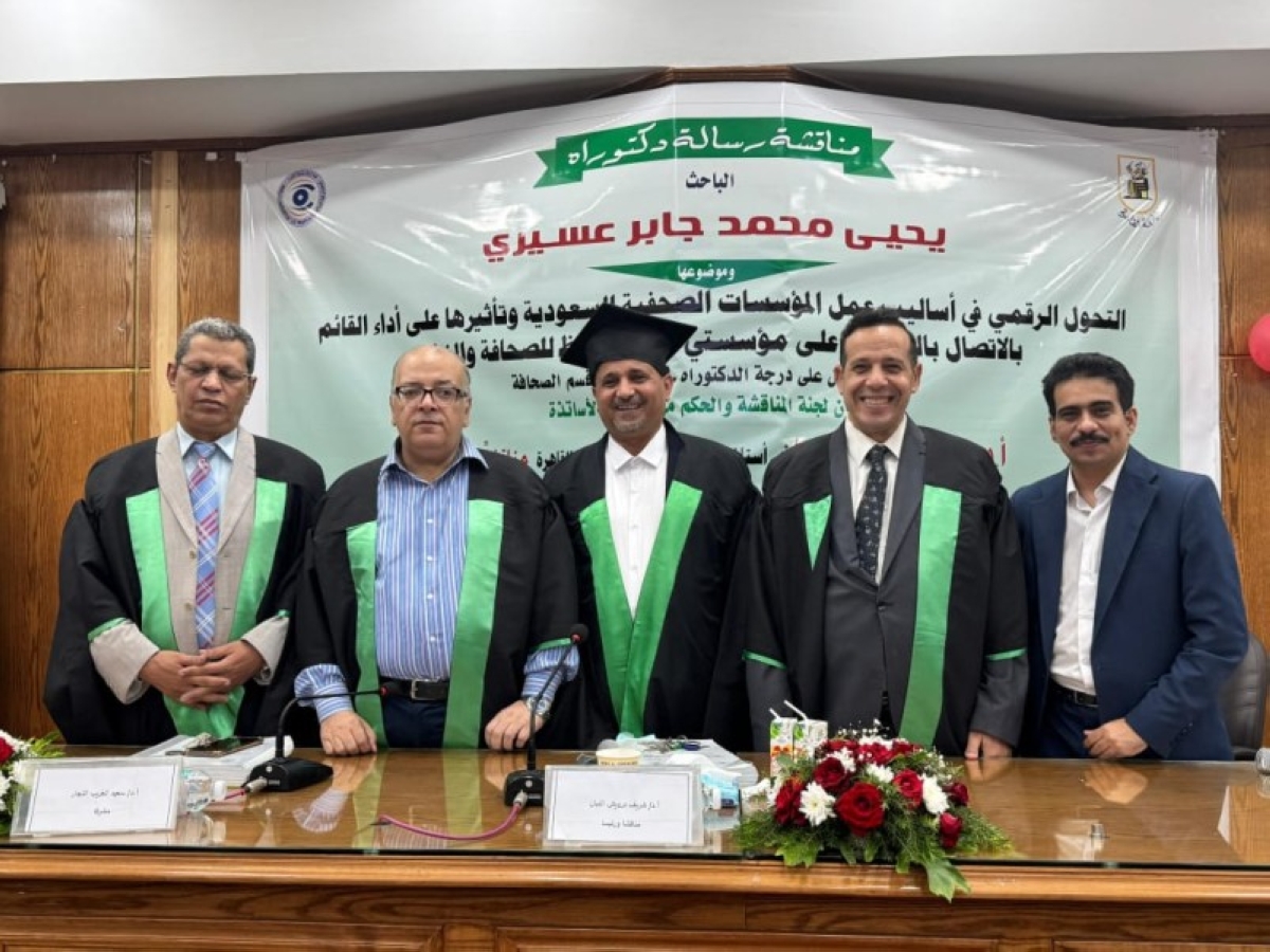ناقشت كلية الإعلام بجامعة القاهرة رسالة دكتوراه بعنوان «التحول الرقمي في أساليب عمل المؤسسات الصحفية السعودية وتأثيره على أداء القائم بالاتصال بالتطبيق على مؤسستي عكاظ وعسير للصحافة والنشر»، للباحث يحيى محمد جابر عسيري. وضمّت لجنة المناقشة الأساتذة: البروفيسور شريف درويش اللبان أستاذ تكنولوجيا الصحافة، والبروفيسور سعيد الغريب النجار أستاذ الصحافة والمشرف على الرسالة، والأستاذ الدكتور محمد ثروت خبير الإعلام الرقمي.