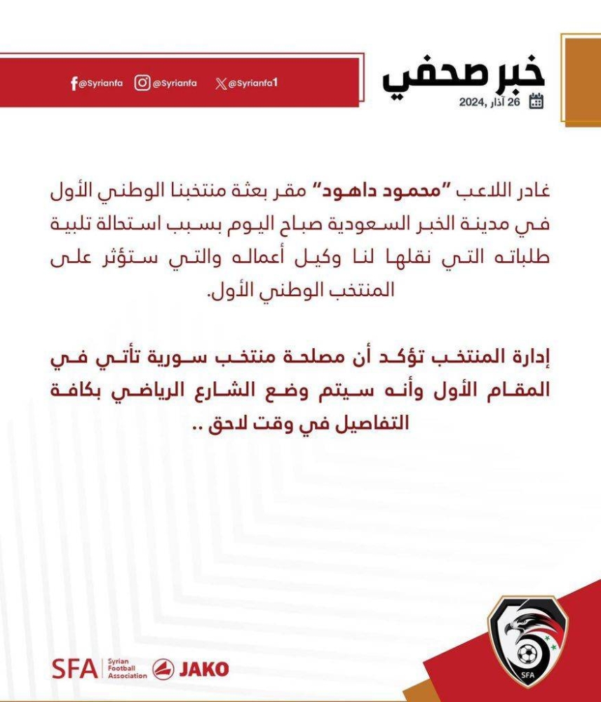 استبعد الاتحاد السوري لكرة القدم، اليوم (الثلاثاء) وقبل ساعات من مواجهة منتخب ميانمار، ضمن منافسات الجولة الرابعة من التصفيات المزدوجة المؤهلة إلى نهائيات لكأس العالم 2026، وكأس آسيا 2027، لاعب فريق شتوتغارت الألماني محمود داهود، من معسكر المنتخب المقام حاليا بمدينة الدمام شرق المملكة العربية السعودية؛ بسبب استحالة تلبية طلباته التي نقلها لنا وكيل أعماله. وقال الاتحاد السوري في بيان رسمي بثه عبر حسابه على موقع التواصل الاجتماعي «فيسبوك»: «غادر اللاعب محمود داهود مقر بعثة المنتخب صباح اليوم، بسبب استحالة تلبية طلباته التي نقلها لنا وكيل أعماله، والتي ستؤثر على المنتخب الوطني الأول»، وأضاف البيان: «إدارة المنتخب تؤكد أن مصلحة منتخب سورية تأتي في المقام الأول وأنه سيتم وضع الشارع الرياضي، بكافة التفاصيل في وقت لاحق».