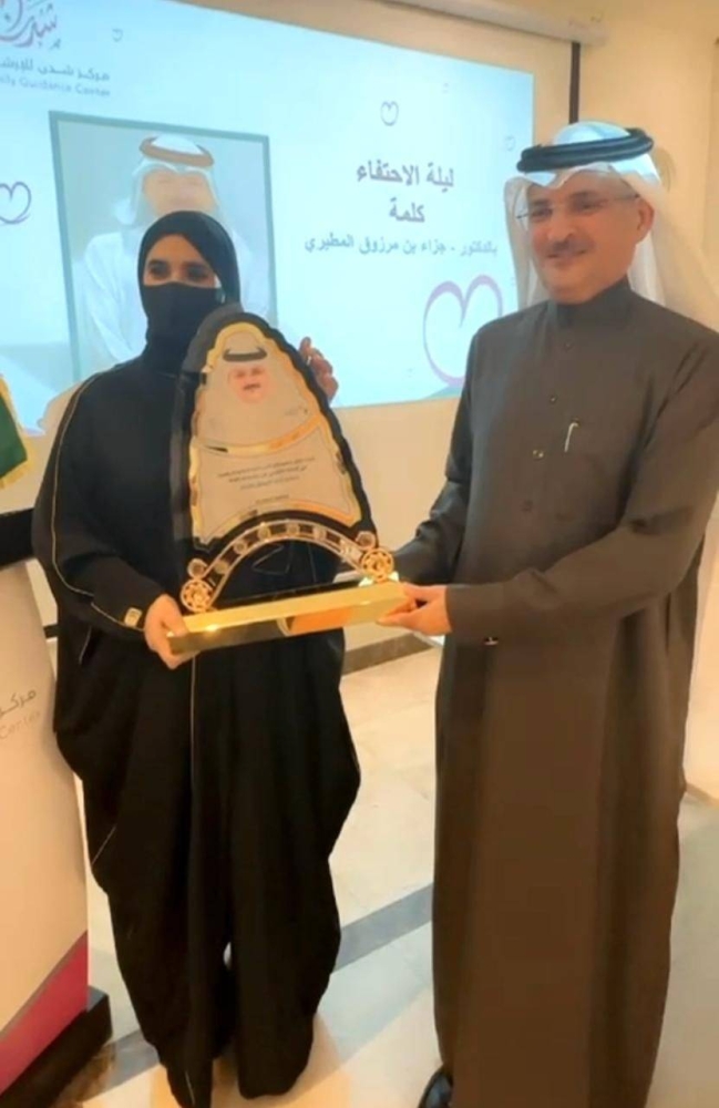 أقام مركز شدن للإرشاد الأسري بجدة مساء أمس حفلة تكريم للمستشار الدكتور جزاء بن مرزوق المطيري، بمناسبة حصوله على درجة الدكتوراه بمرتبة الشرف الأولى بالإرشاد النفسي بجامعة أم القرى، بحضور ومشاركة مستشاري المركز وعدد من وجهاء المجتمع الجداوي.