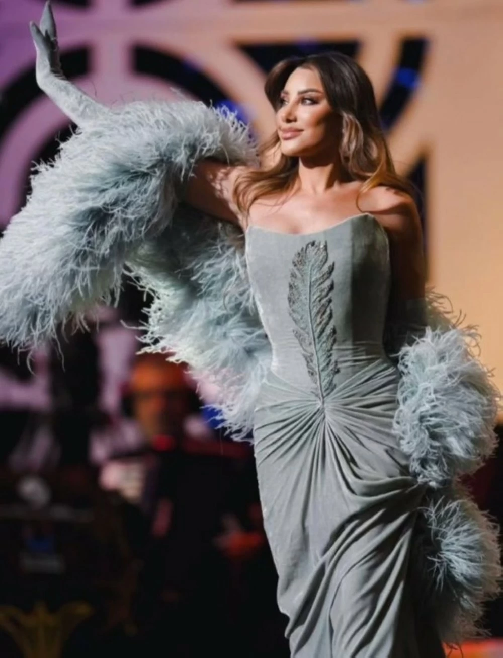 The upper part featured a clearly defined corset design, enhancing Najwa Karam’s strong presence on stage, while the long gloves made of the same material added a luxurious theatrical touch.