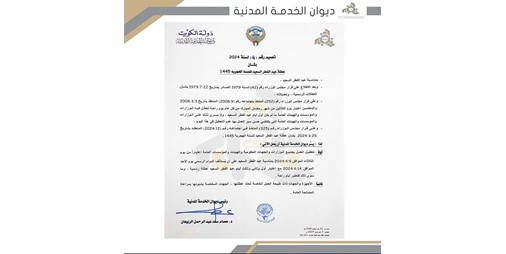 أصدر رئيس ديوان الخدمة المدنية د.عصام الربيعان تعميما برقم 4 لسنة 2024 بشأن عطلة عيد الفطر السعيد للسنة الهجرية 1445هـ، جاء فيه: تعطيل العمل بجميع الوزارات والجهات الحكومية والهيئات والمؤسسات العامة اعتبارا من 9 الجاري واستئناف الدوام 14 منه. وتحدد الجهات المختصة بشؤون الأجهزة ذات طبيعة العمل الخاصة عطلتها بمراعاة المصلحة العامة.