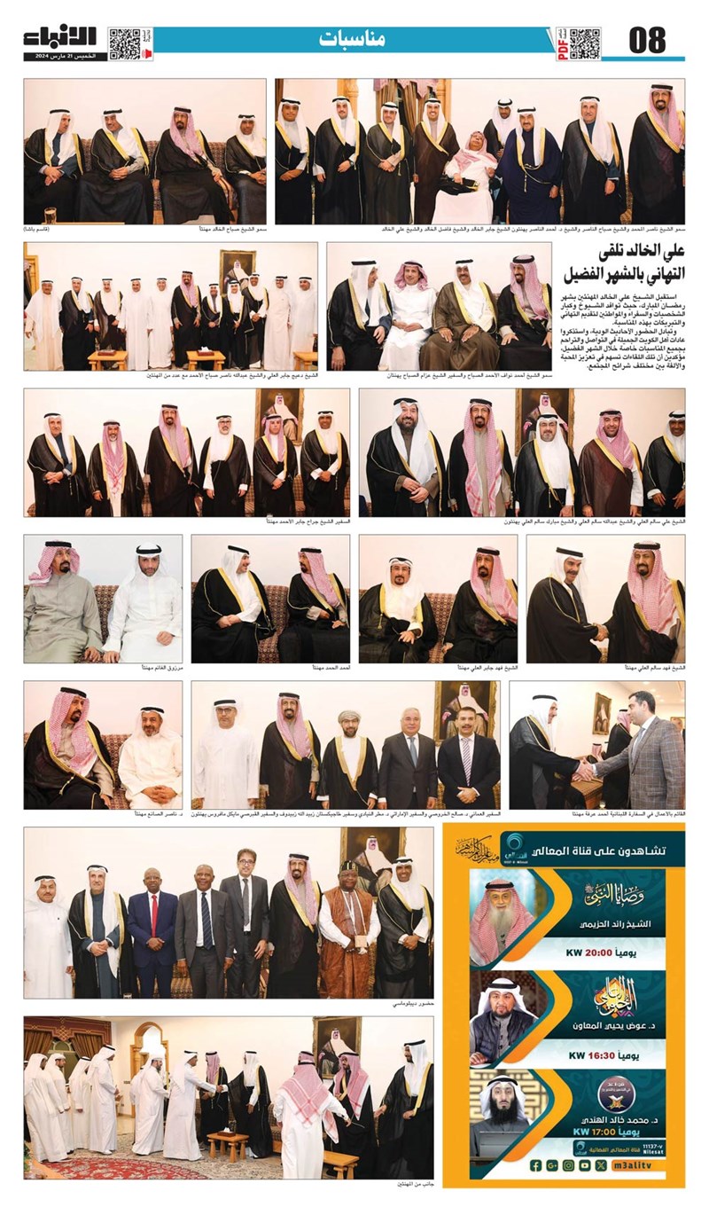 استقبل الشيخ علي الخالد المهنئين بشهر رمضان المبارك، حيث توافد الشيوخ وكبار الشخصيات والسفراء والمواطنين لتقديم التهاني والتبريكات بهذه المناسبة.