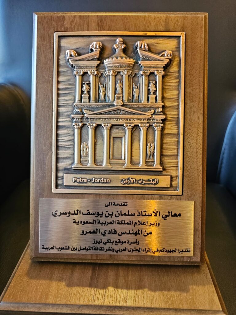 كرم الموقع الإخباري الأردني “بلكي نيوز”، وزير الإعلام، سلمان بن يوسف الدوسري، بـ “درع تذكاري”، تقديرًا لجهوده في إثراء المحتوى العربي ونشر ثقافة التواصل بين الشعوب العربية.