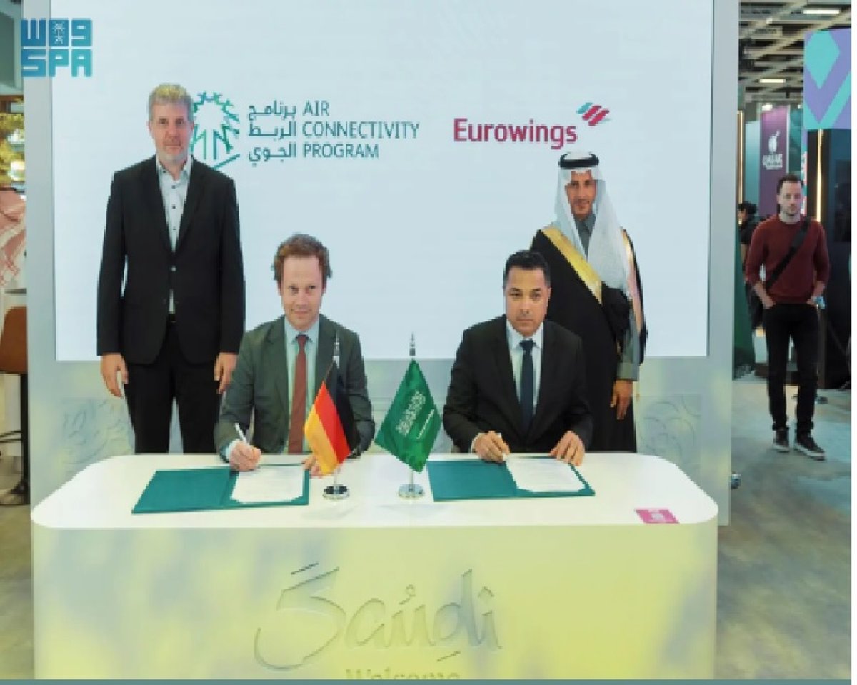 وقّع برنامج الربط الجوي -على هامش مشاركة منظومة السياحة بالمعرض الدولي لصناع السياحة المقام بالعاصمة الألمانية برلين-، اتفاقية تعاون مع خطوط “يورو وينغز” الألمانية، وذلك بحضور معالي وزير السياحة الأستاذ أحمد بن عقيل الخطيب.