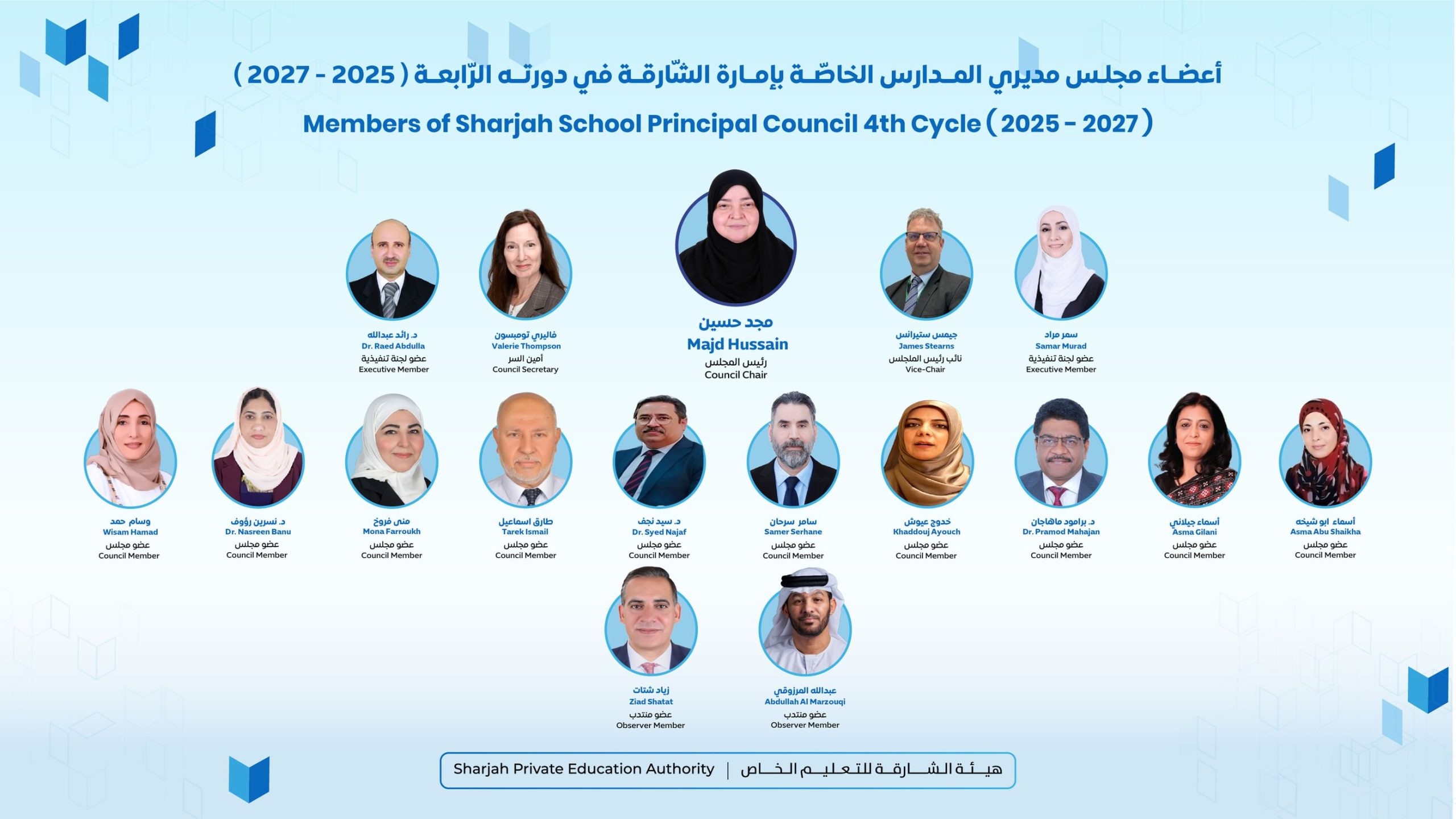 وضم تشكيل مجلس مديري المدارس الخاصة كلاً من، خدوج حسن عيوش، وأسماء جيلاني، والدكتور برامود ماهاجان، وسيد نجف علي شاه، وأسماء محمد علي أبو شيخة، والدكتورة نسرين بانو بيدريهالي رؤوف، وطارق شيخ إسماعيل، ووسام إبراهيم حمد، وسامر محمود، ومنى محمد أعضاء في المجلس.