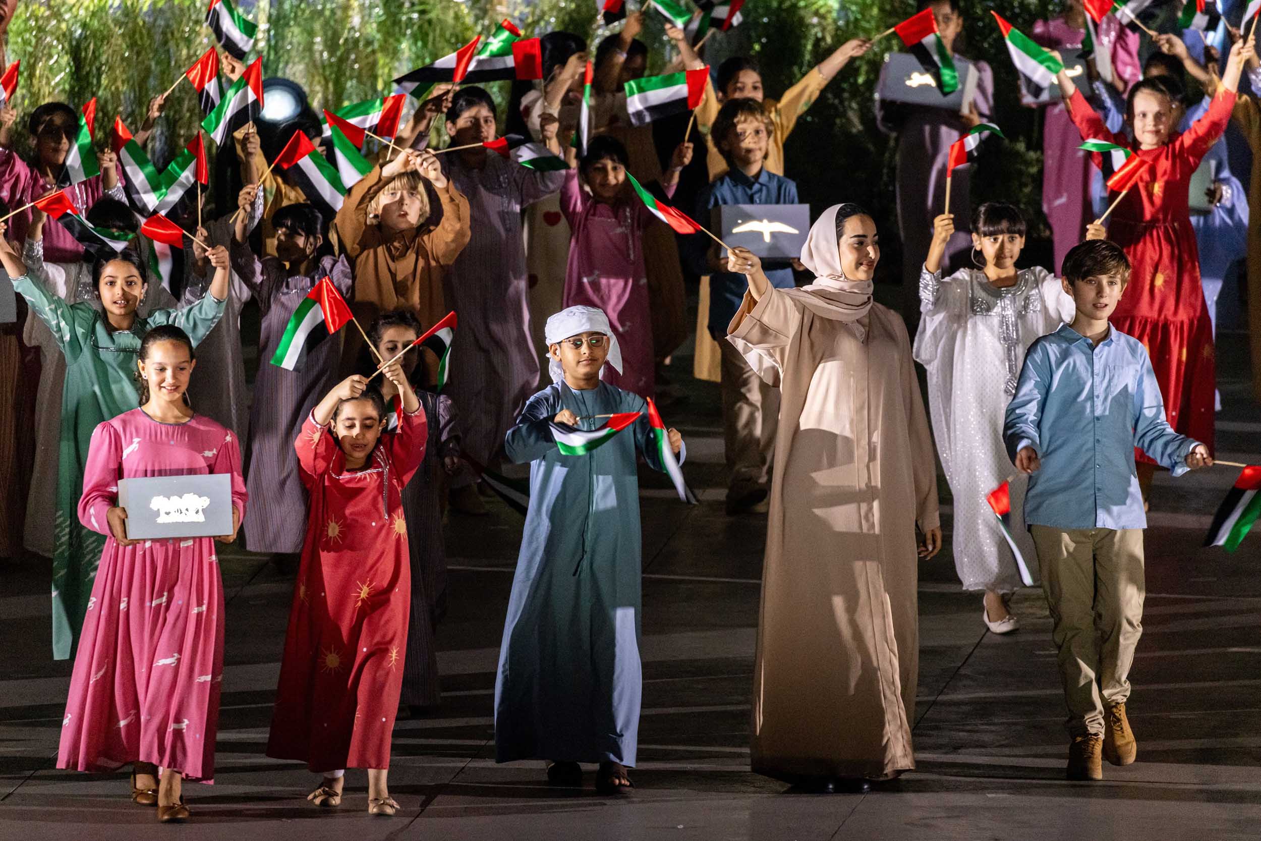 واستلهم العرض من إرث المغفور لهما الشيخ زايد بن سلطان آل نهيان والشيخ خليفة بن زايد آل نهيان “ طيب الله ثراهما ” ، اللذين تمسكا بقيم التنمية المستدامة وتمكين العالم، وأشاد العرض بالقيادة الحكيمة لصاحب السمو الشيخ محمد بن زايد آل نهيان رئيس الدولة “حفظه الله”، وسلط الضوء على قصة دولة الإمارات، من الماضي عبر الحاضر وإلى المستقبل، مجسدًا وحدة شعبها وصمودها.